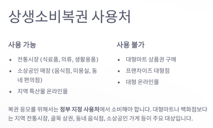 대형마트나 백화점보다는 지역 전통시장, 골목 상권, 동네 음식점, 소상공인 가게 등이 주요 대상입니다.