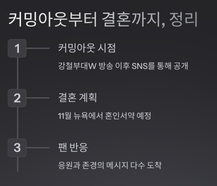 커밍아웃 시점 | 강철부대W 방송 이후 SNS를 통해 공개 |