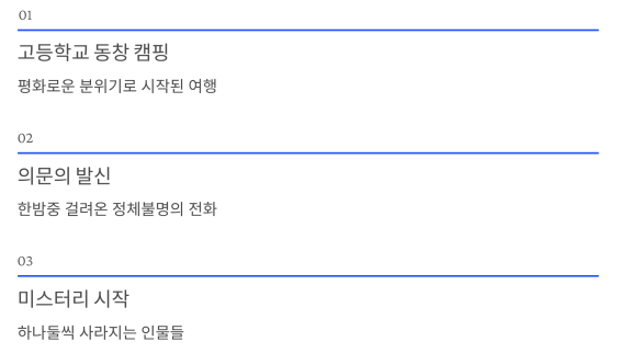 이야기는 고등학교 동창들이 모여 캠핑을 떠나며 시작됩니다.