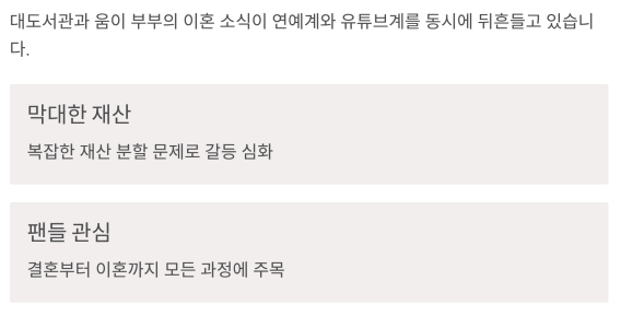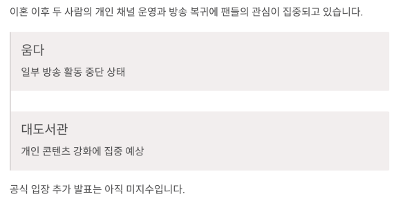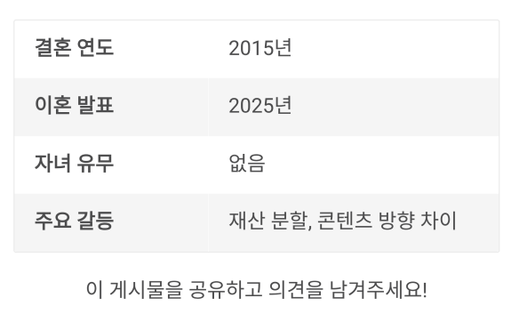 | 주요 갈등 요인 | 재산 분할, 콘텐츠 방향 차이 등 |