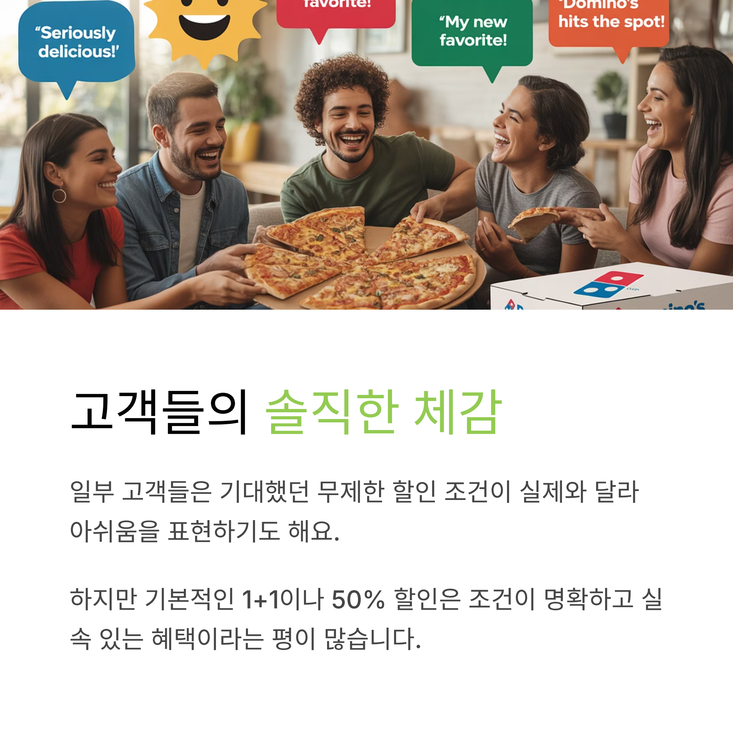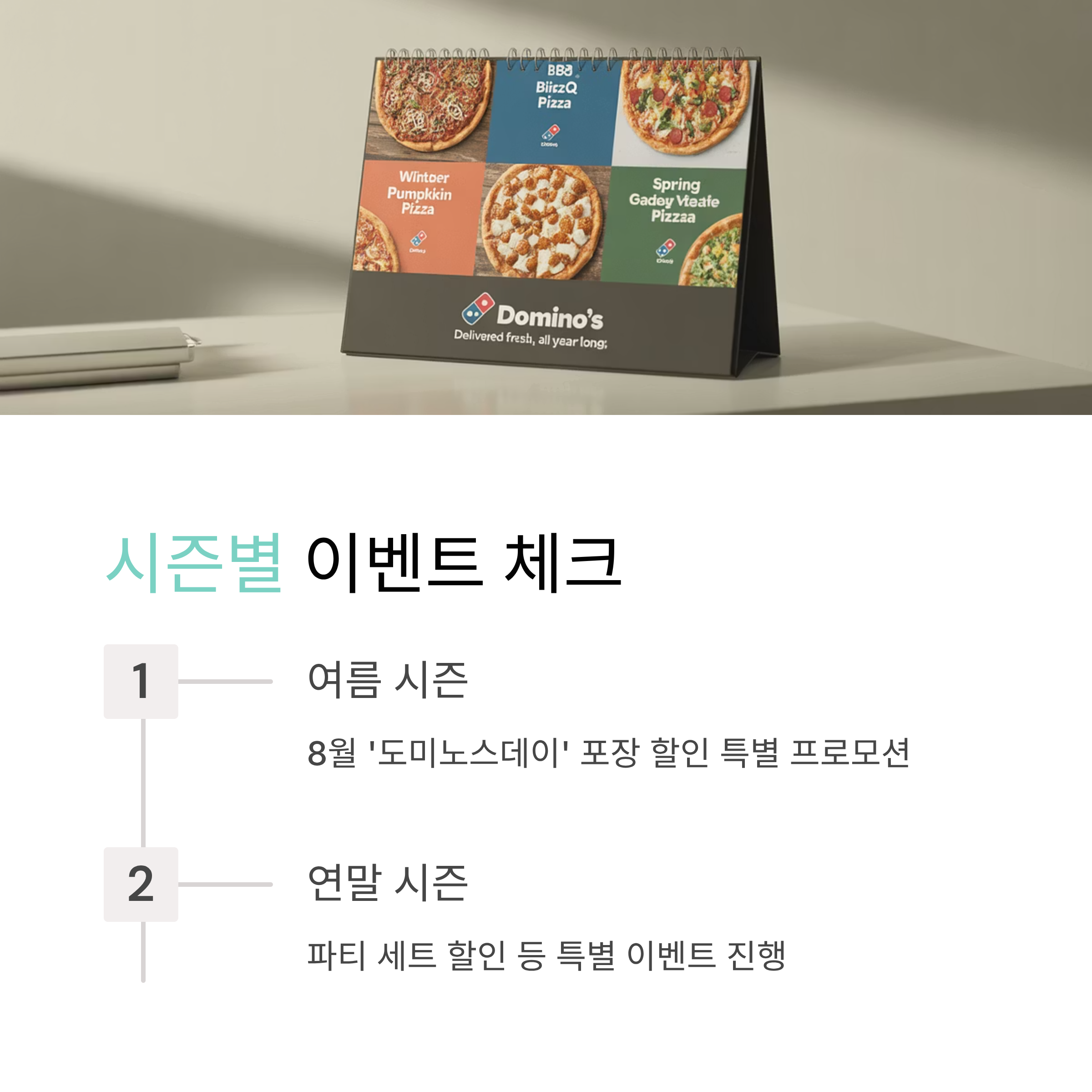 예를 들어 8월에는 ‘도미노스데이’ 포장 할인, 연말에는 파티 세트 할인 같은 이벤트가 진행되니 시기별로 확인해두면 좋습니다.