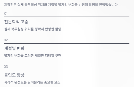 제작진은 실제 북두칠성 위치와 계절별 별자리 변화를 반영해 촬영을 진행했다고 밝혔습니다.