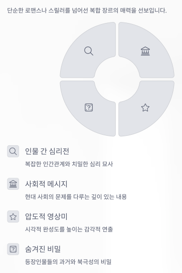 특히 인간 심리를 치밀하게 파고드는 대사와 감각적인 영상미가 돋보입니다.