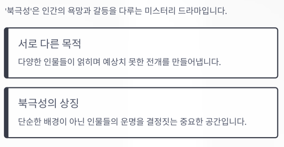 또한 등장인물들의 숨겨진 과거와 북극성이 가진 비밀이 풀릴수록 긴장감은 더욱 높아집니다.