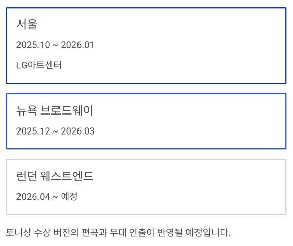 | 뉴욕 브로드웨이 | 2025.12 ~ 2026.03 |