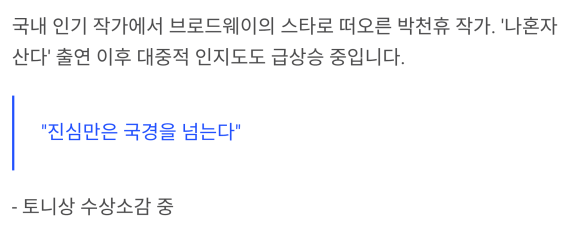 그러나 이번 토니상 수상을 통해 그는 미국 브로드웨이에서도 가장 주목받는 작가로 떠올랐습니다.