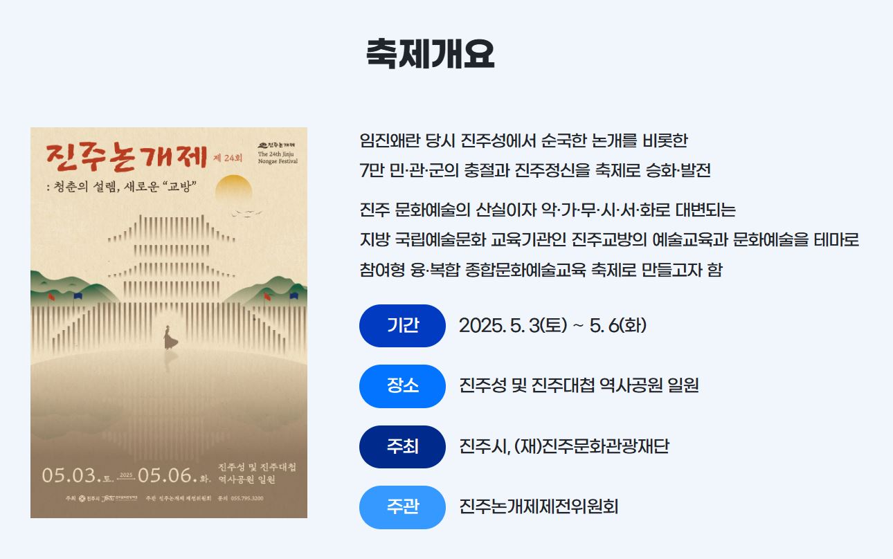 역사와 문화가 숨 쉬는 진주의 5월, ‘제24회 진주논개제’에서 가족, 친구, 연인과 함께 특별한 하루를 보내보세요. 진주성 촉석루를 배경으로 펼쳐지는 다채로운 행사와 공연, 체험은 일상에서 벗어나 역사와 함께 호흡하는 소중한 경험을 선물할 것입니다. 지금 바로 일정 확인하고 참여 계획을 세워보세요!