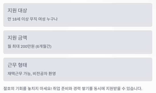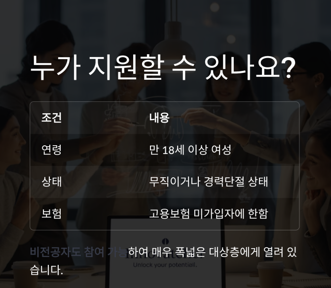 만 18세 이상 무직 여성이라면 누구나 지원 가능하며,