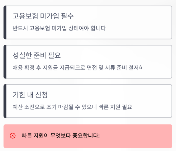 - 채용 확정 후 지원금이 지급되므로 면접 및 서류 준비는 성실히 해야 합니다.