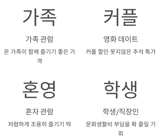 | 가족과 영화 관람 예정 | 온 가족이 함께 즐기기 좋은 가격 |