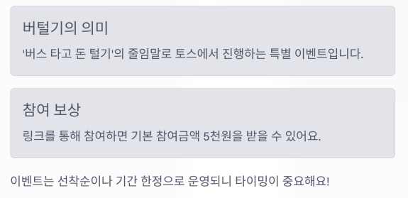 ‘버털기’는 ‘버스 타고 돈 털기’의 줄임말로, 토스에서 특정 미션을 수행하면 보상을 주는 이벤트 형식입니다.