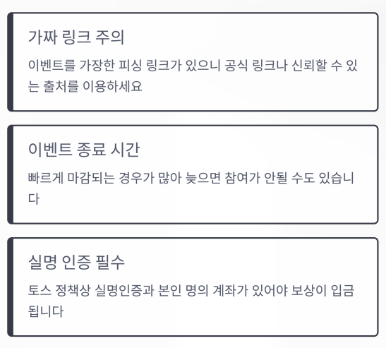 - 실명 인증 및 계좌 확인 필수: 토스 정책상 실명인증과 본인 명의 계좌가 있어야 보상이 입금됩니다.