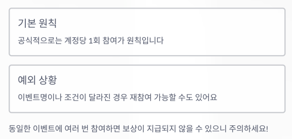 단, 동일한 이벤트에 여러 번 참여하면 보상이 지급되지 않을 수 있으니 주의하세요!
