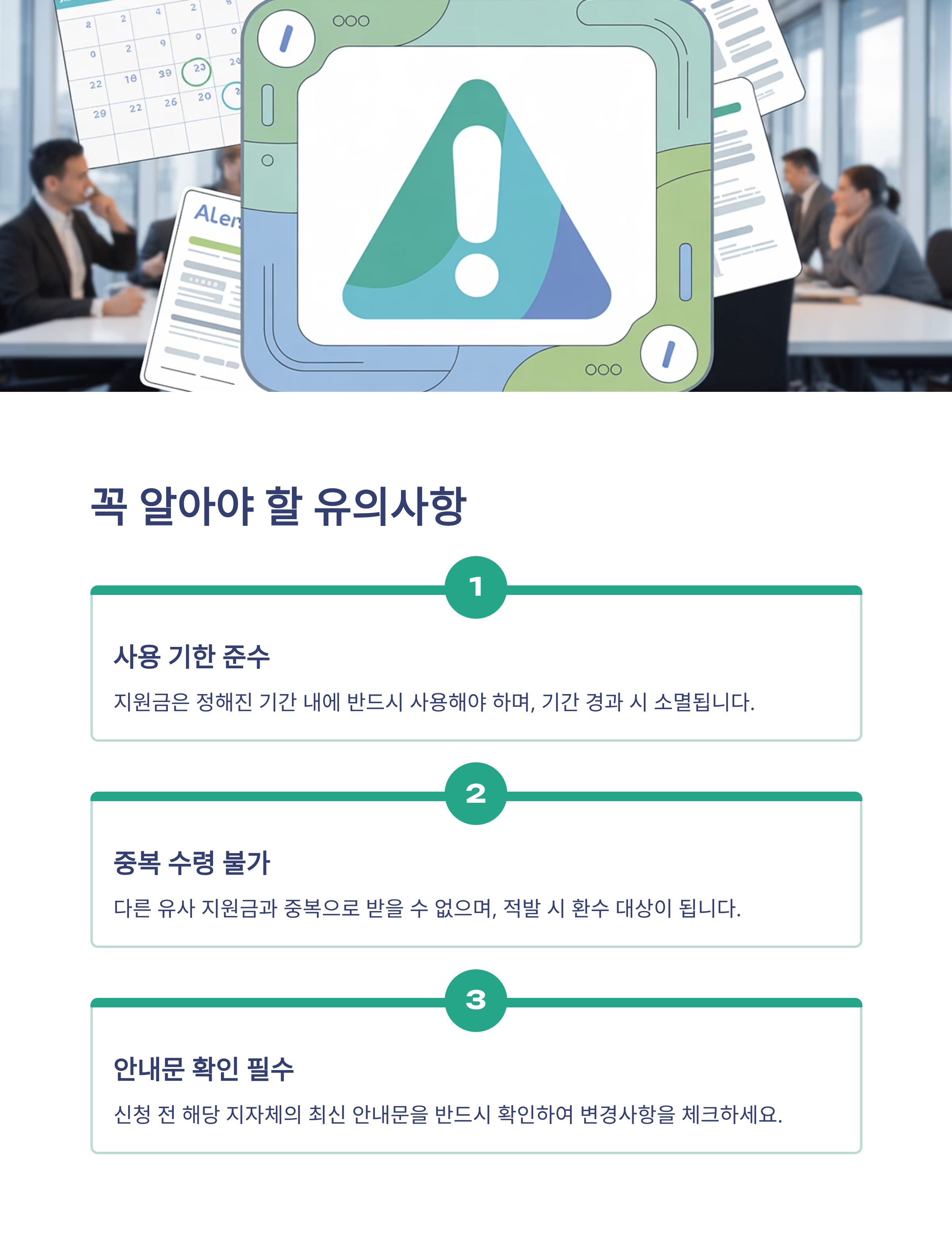 - 중복 지원 여부 확인: 여타 복지제도와 중복 수령이 안 되는 경우가 있습니다.