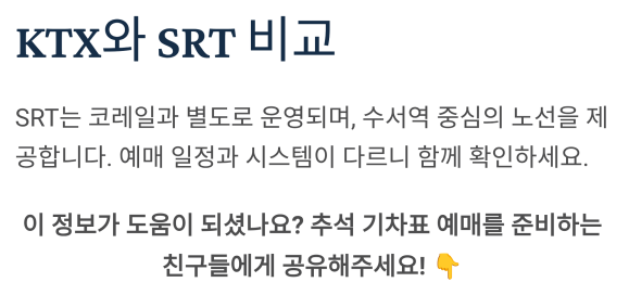 | 예매 경로 | 레츠코레일, 코레일톡 | SRT 앱, 홈페이지 |