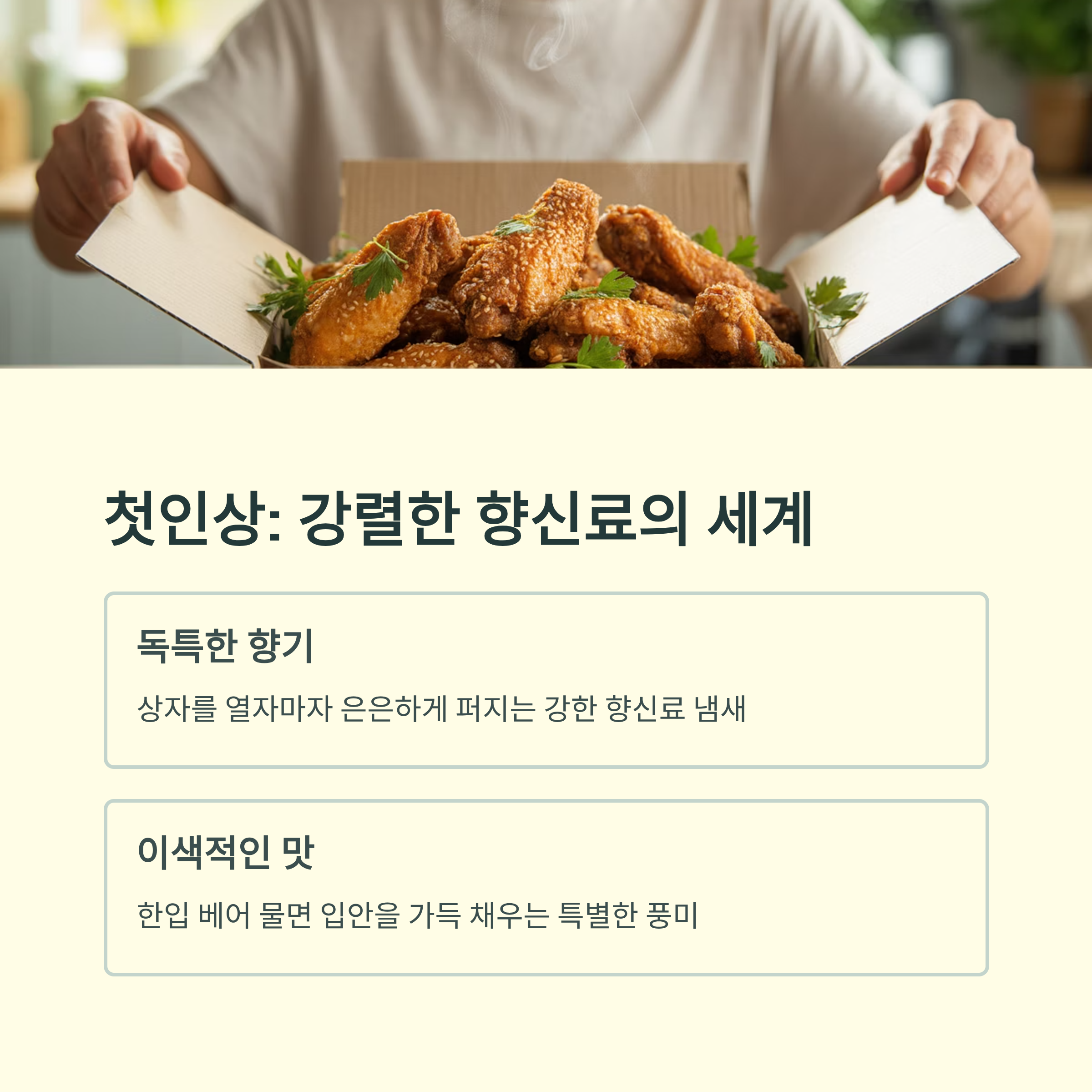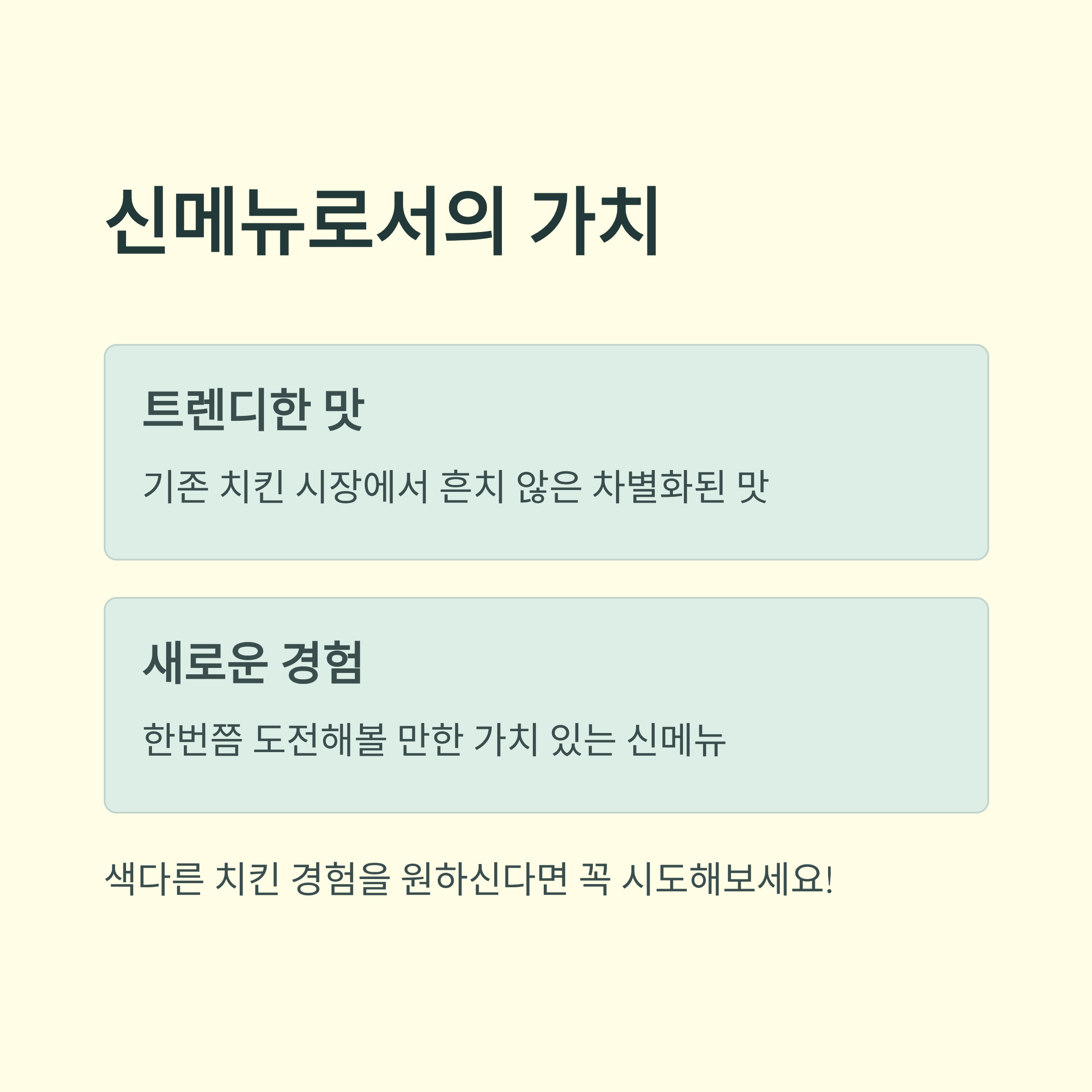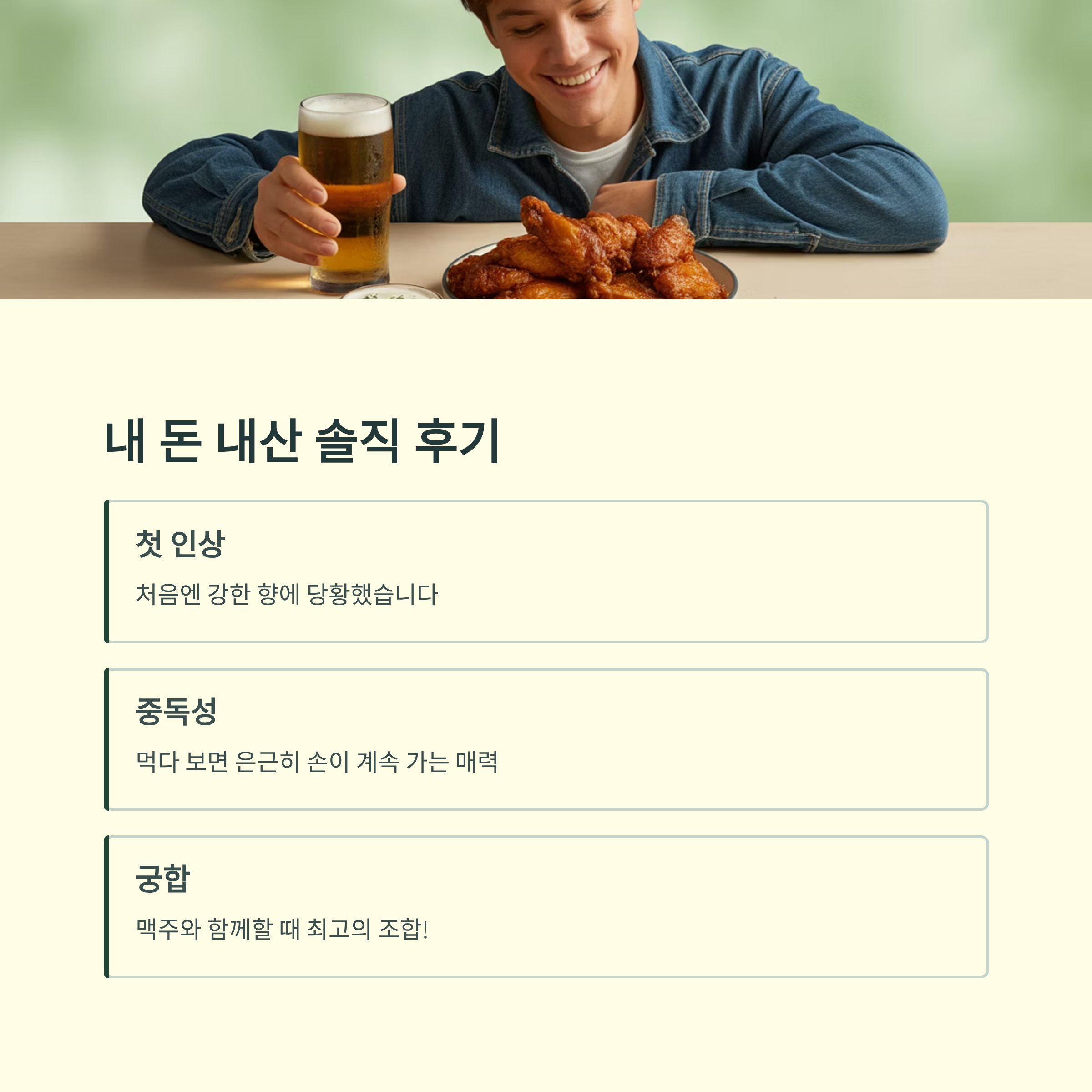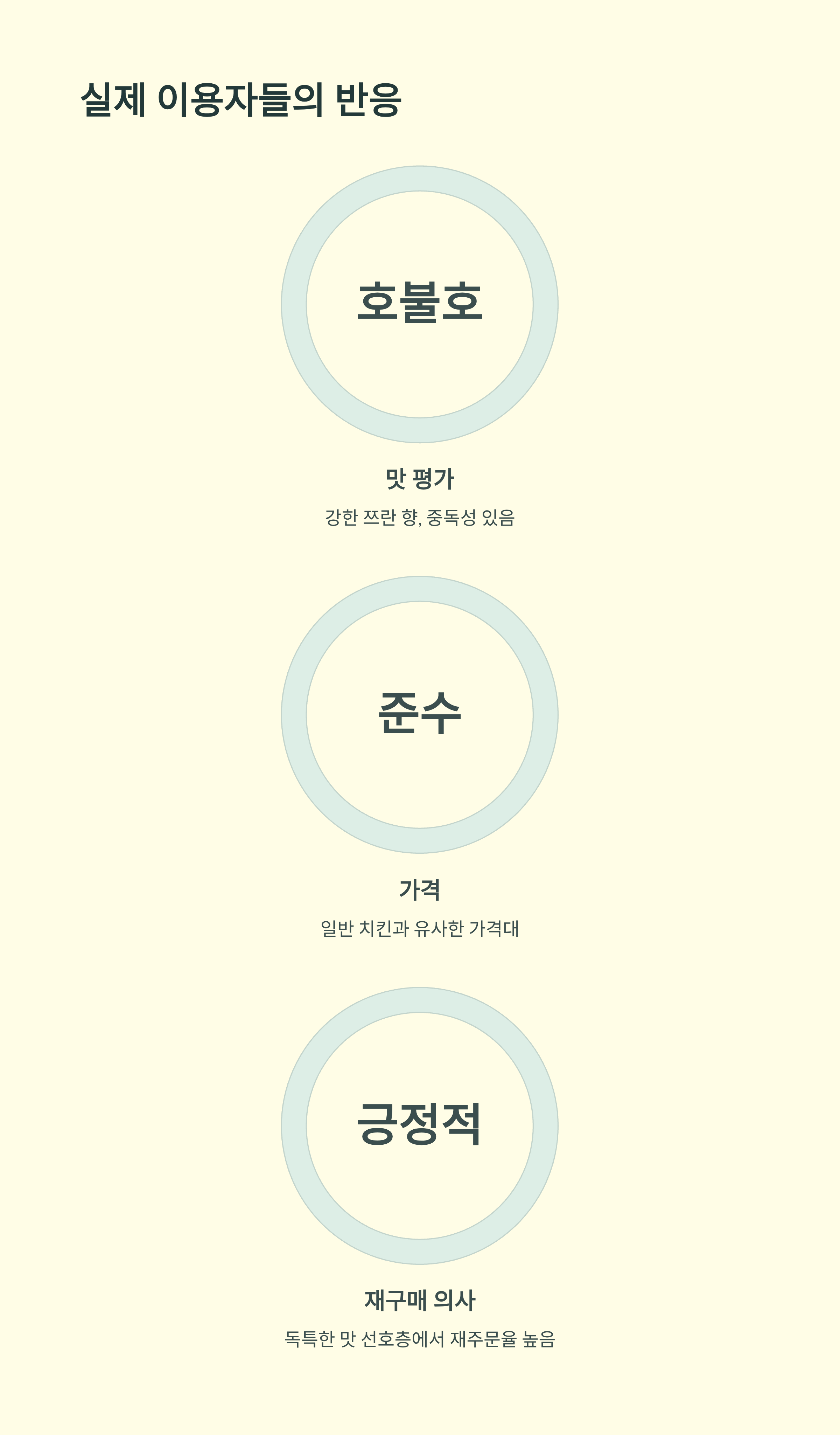 새로운 시도를 반영한 메뉴답게 기존 치킨 시장에서는 흔치 않은 맛입니다.